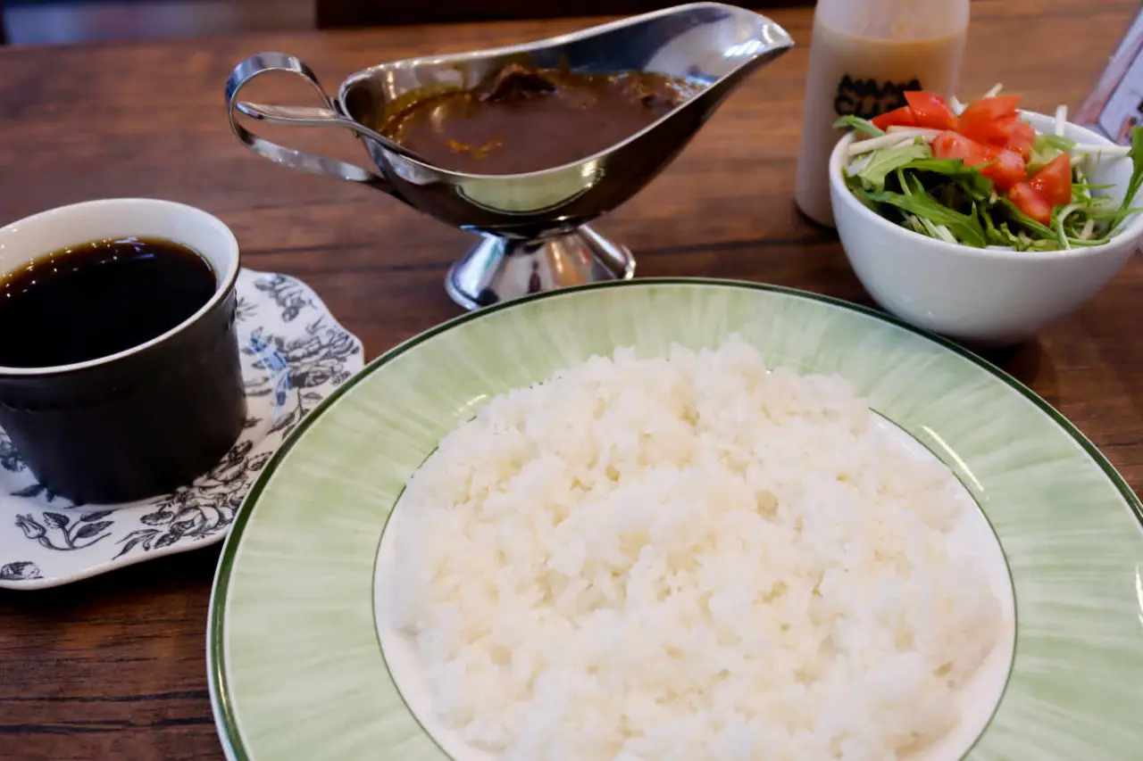 食後には、セットのホットコーヒーを。美しい絵柄のカップで提供される一杯は、カレーの余韻を優しく包み込み、心落ち着くひとときを演出してくれました。